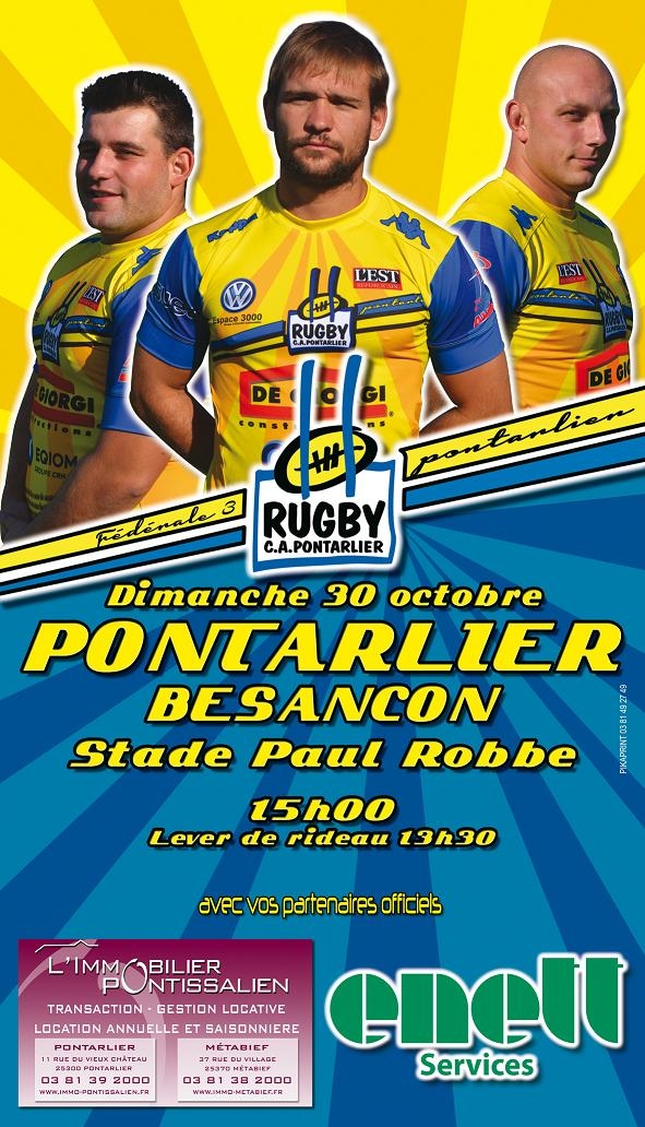 2 eme mt des Bisontins plus sanctioné faisait le bonheur de l'ouvreur Pontissalien De Lange qui creusait l'écart 15 a 6 Les capistes était un peut plus dominateur et il me semble que c'est Bouland qui inscrit le 1er essai de la rencontre entre les perches 59eme les joueurs de l'OB en prenait un coup sur la tete et c'est Azzi qui sonnera leur glas en marquant le second essais en coin 27 a 9 plus rien ne sera marqué meme l'entrée de Salvi réclamé part ces supportrice ne changera rien( voila c'est fait) une rencontre disputé dans un bon état esprit pour un derby une defense Pontissalienne impeccable qui ne laissera rien passé il fallait de l'engagement pour l'emporter tout les joueurs l'on donné après 2 défaites de suite content de renouer avec la victoire face a l'ob