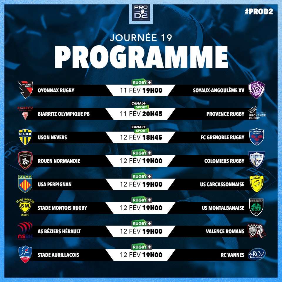 La programmation de cette journée (2 matches) est logique avec Nevers-Colomiers et BO-Grenoble. Par contre, celle d'après, on a 3 matches diffusés avec une anomalie à savoir Valence-Romans vs le BO.
