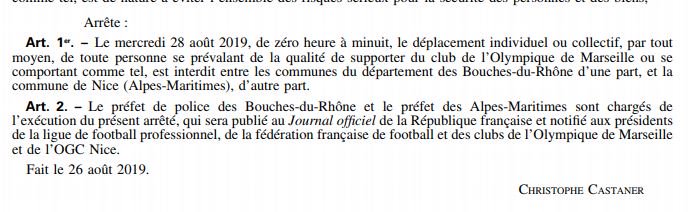 Voilà ce que ça donne en pratique. Demain, les supporters de l'Olympique de Marseille n'aura pas le droit de se déplacer....dans les Bouches du Rhône !